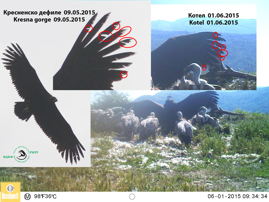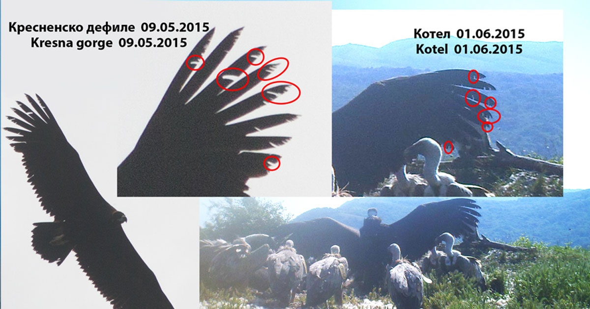 Това става ясно, след като най накрая успяхме да направим снимка на птицата с разперени крила край Котел, за да стане възможно сравнението по метода “визуално маркиране” с птицата заснета в Кресненския пролом. Вижте сравнението на снимките по споменатия метод, който е разработен и публикуван от екип на ФДФФ през 2014* и 2015**.