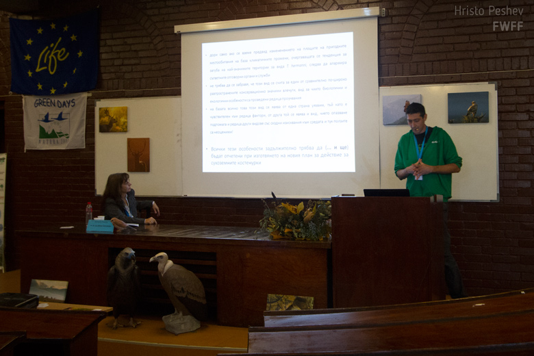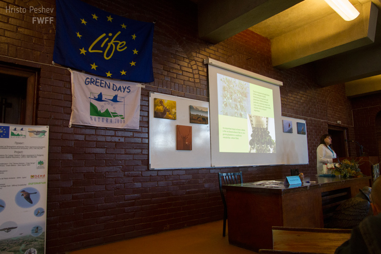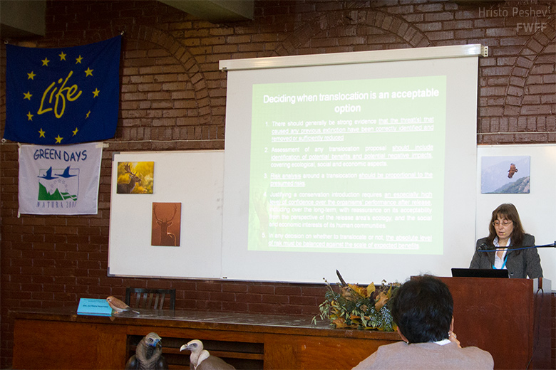 Успехите и трудностите в изпълнението на първия успешно приключил реинтродукционен проект, финансиран по Програма Лайф + на ЕС, в изпълнение на СНЦ Зелени Балкани- Стара Загора, Фонд за дивата флора и фауна и Дружество за защита на хищните птици, бяха преставени от Елена Кметова– ръководител на проекта „Връщане на лешоядите“ в „Възстановяване на белоглавия лешояд в Стара планина“.