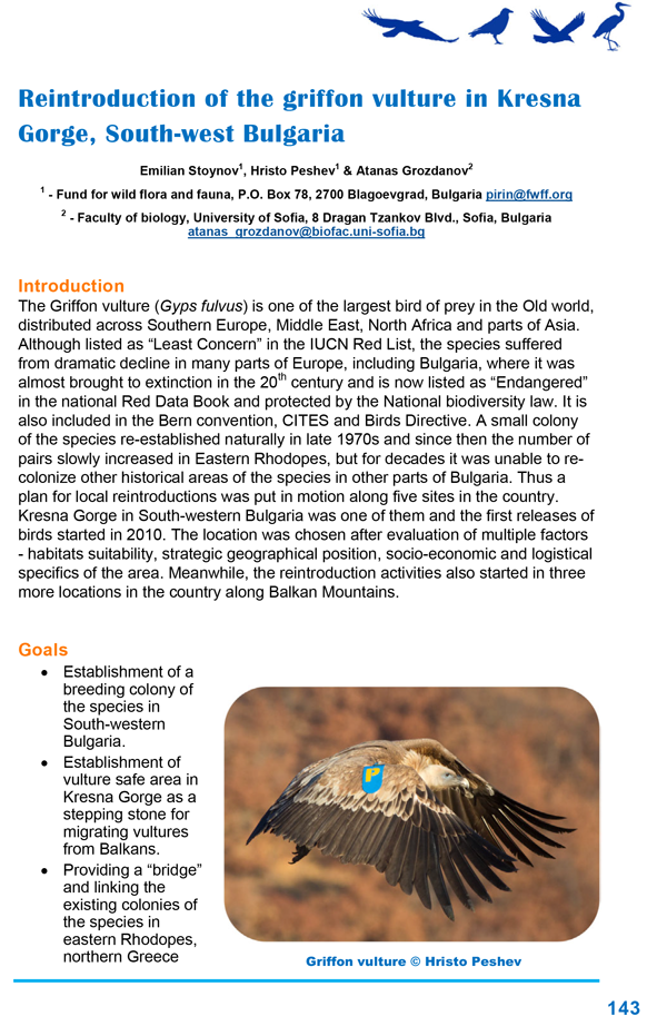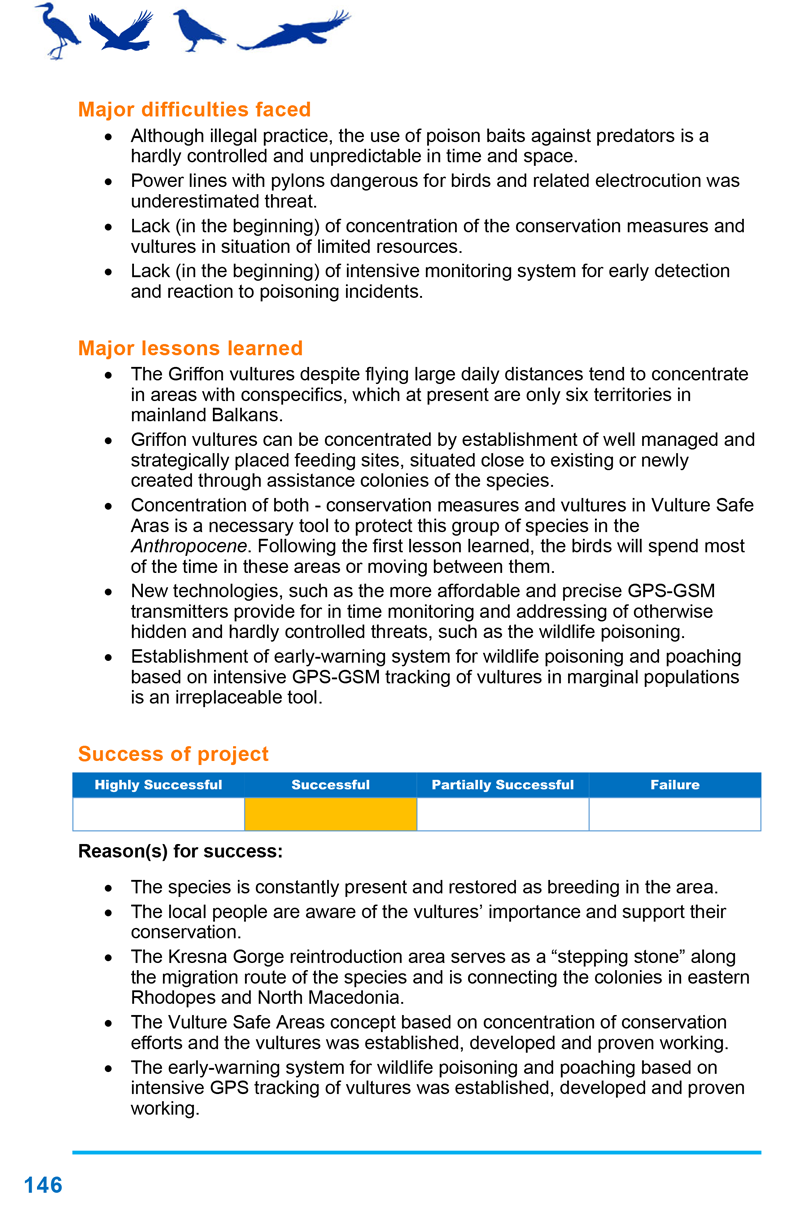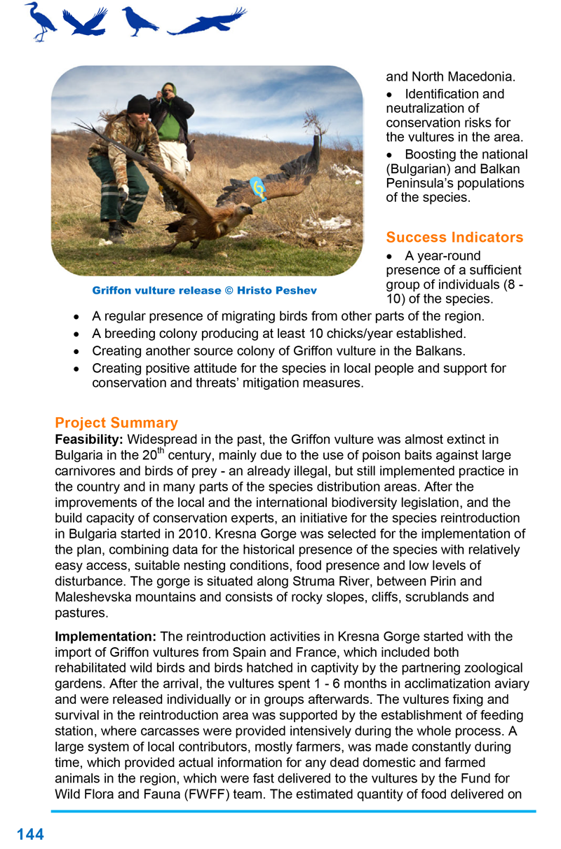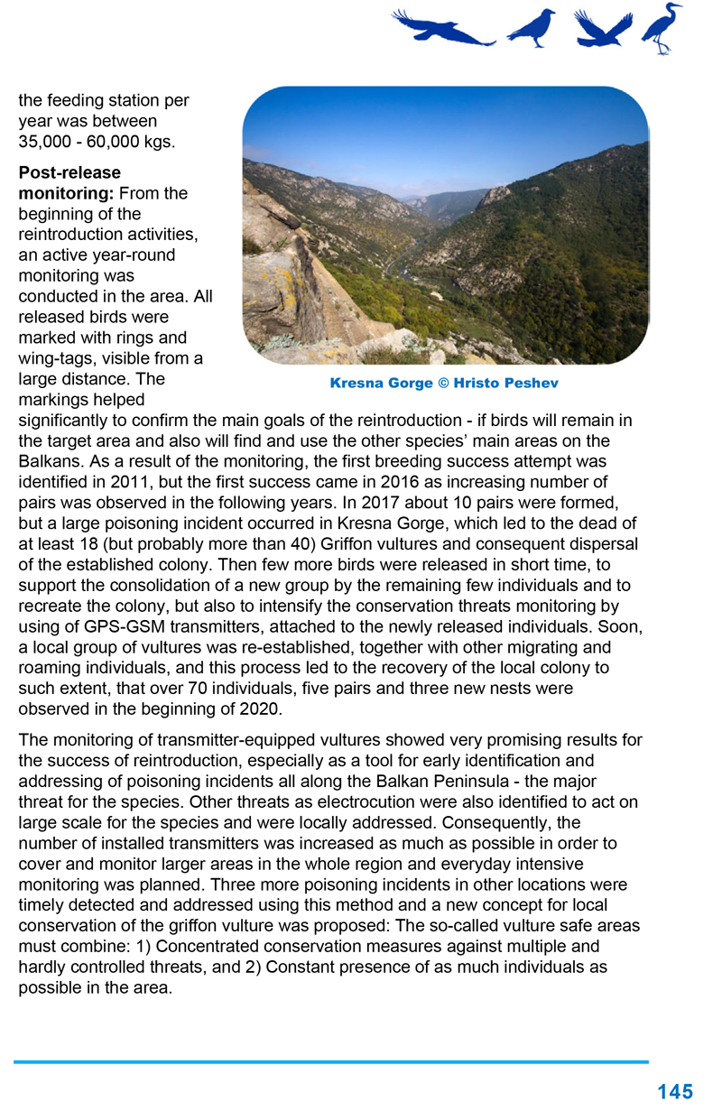 Излезе седмото издание на the Global conservation translocation perspectives от серията на престижната публикация на IUCN група на специалисти по консервация и транслокация. То включва 69 проекта по света, отделени в 8 глобални района. Реинтродукцията на белоглав лешояд в Кресненския пролом намери място в изданието.